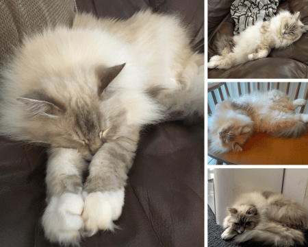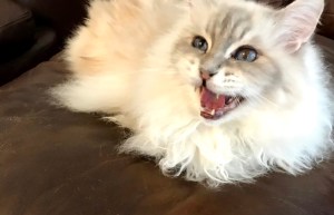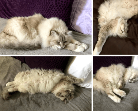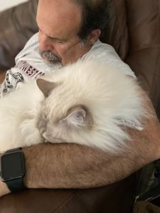 This is going to be a long ramble, sorry! We also had a vicious rescue. I’ve had rescue cats since I was a teen, and until we got Edgar, never had a problem. When we got Edgar from the shelter, they told us he was an orphan and I thought, aren’t they all orphans? Isn’t that why they’re here? Turns out an orphan cat is one that was taken from its mother too young and never learned social skills. Edgar was a biter. My husband almost ended up in the hospital on several occasions, and my daughter did end up in the hospital. We tried drugs, aromatherapy (seriously!) and nothing helped. We had him for about 2 years and when I woke up one morning from him biting my ankle and blood all over the bed, I couldn’t take it anymore. The no-kill shelter said to put him to sleep, or they would take him back but if he bit anyone he would be relegated to one of those tiny cages for the rest of his life. The vet said he was brain-damaged (he was also visually impaired and hard of hearing) and suggested we put him down. I was heartbroken but I would have done it, I could not live with that cat anymore. But my husband is a think-outside-the-box kind of guy and has the biggest heart. He built him an 8’x8’x8′ cage out on our screened-in porch. He moved out there, Larry would let him out on the porch during the day, and he seemed happy. He never tried to get in the house and he still tried biting my husband when he fed him! By that point, I was scared of cats. My husband had a client who had 3 Birman cats and he just loved them. He said they were the sweetest cats he’d ever seen. He found the name of a couple of breeders and we checked them out. One of them was far superior than the rest. She lived in a huge house and had 8 Birman moms living with her. The others had cages in the garage type setups. Not inspiring. One of the moms was due to give birth in a couple of weeks. We waited, and met Loki when he was 7 days old. She encouraged us to visit, and we did, weekly, until she felt he was old enough to leave home. You can see his mom in one of the baby pictures. Well, Loki cured my fear of cats. I never thought I was the kind of person who would get a pet from a breeder, but life pointed me in that direction. And that is the happy ending to this long, rambling tale!