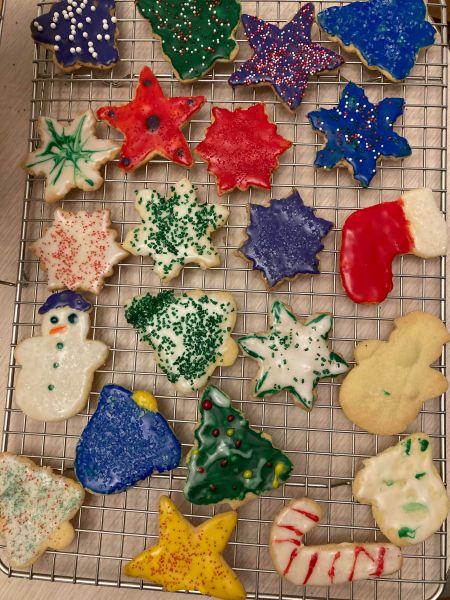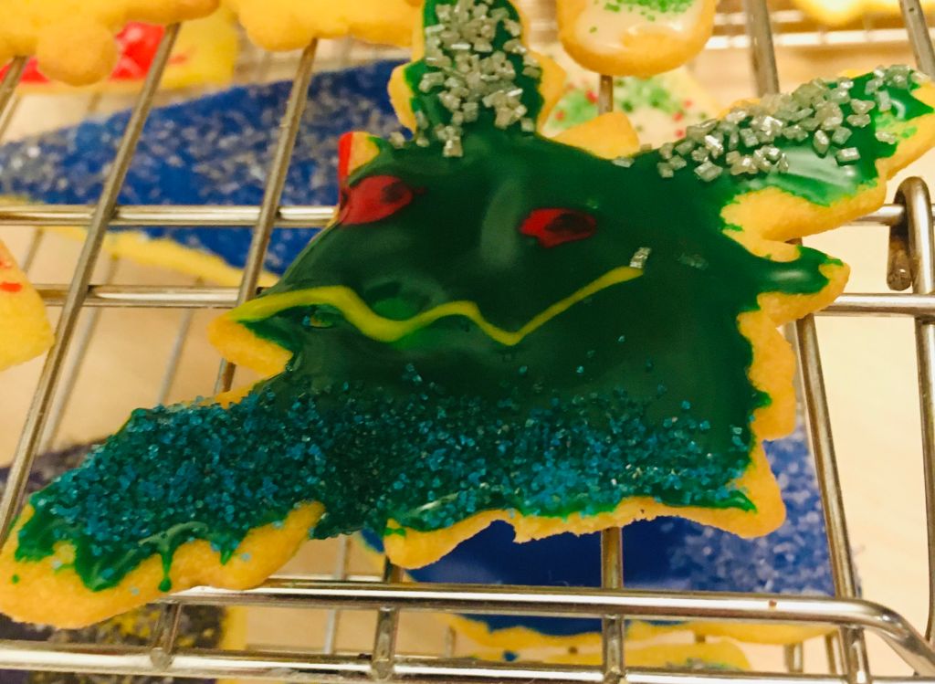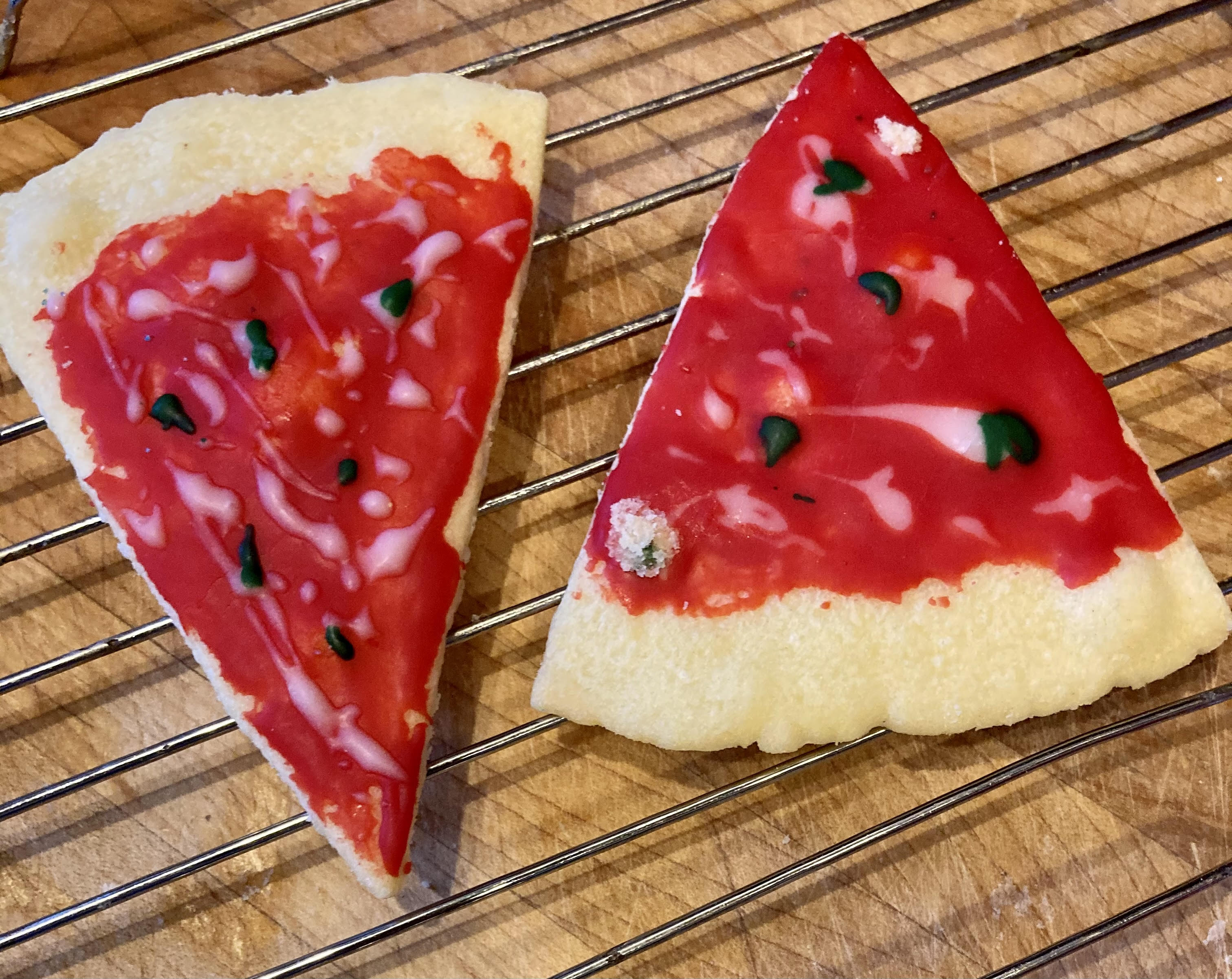 Another Christmas tradition we have is my daughter and I make Christmas cookies. Well, usually we make Hanukkah cookies but I couldn’t find the cookie cutters. So Christmas it was. I have to say I missed my daughter-in-law, she was here last December and helped us decorate the cookies so it was a little bit bittersweet. After I’d rolled out the dough twice, I took all the scraps and rolled them into a circle and just cut them into triangles to use up the rest of the dough. Ariel took one look and asked if those were pizza cookies, so yes, that’s what they ended up looking like!