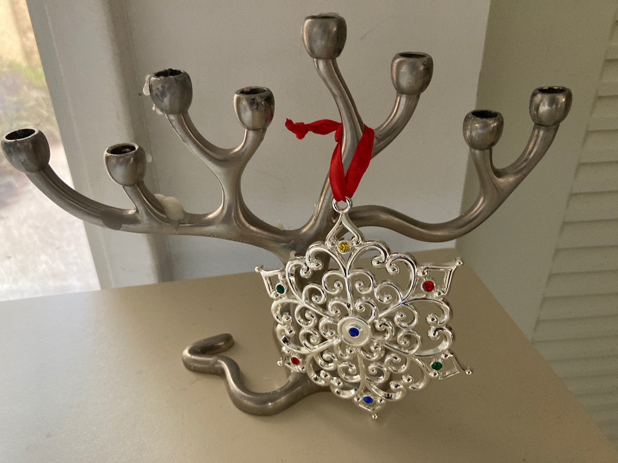 We don’t really celebrate Christmas at my house. I’m Jewish, my children were brought up Jewish, and my husband is an atheist. He was brought up with Christmas but not with religion, if that makes sense. The only time his family went to church was for his baptism. His family all celebrate Christmas but I don’t know if church is involved in any of their celebrations. My sister-in-law in California (Hi Anita! Merry Christmas!) sent us a beautiful card and a Christmas ornament. It is hanging on the menorah for lack of a better place for it. She said she felt like our Aunt Jean, who recently passed away, was telling her to get it for us. I can’t argue with that! It will always be special in my heart.