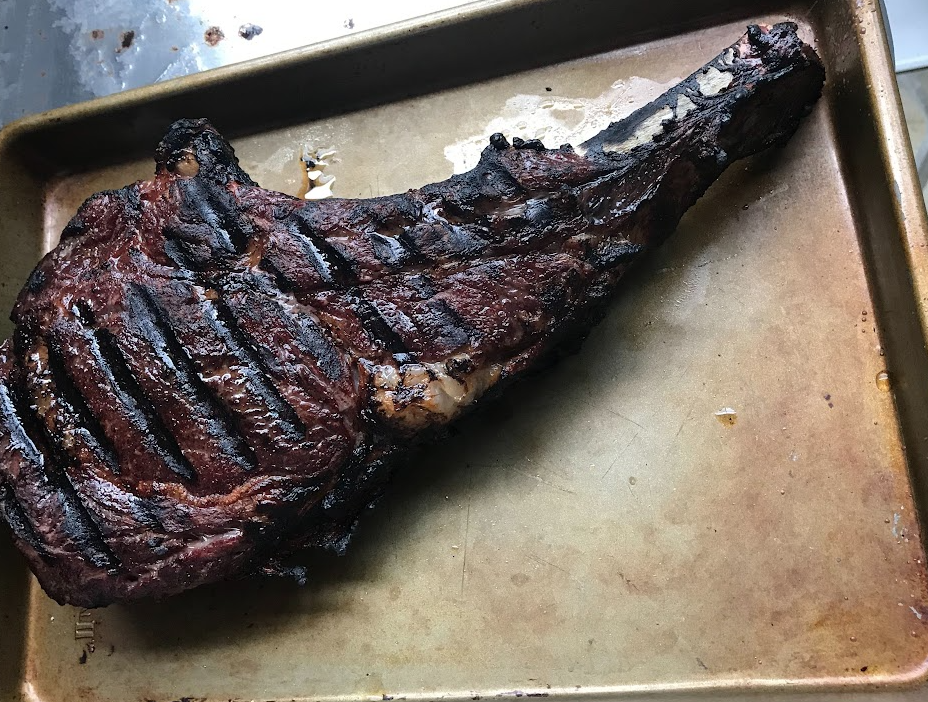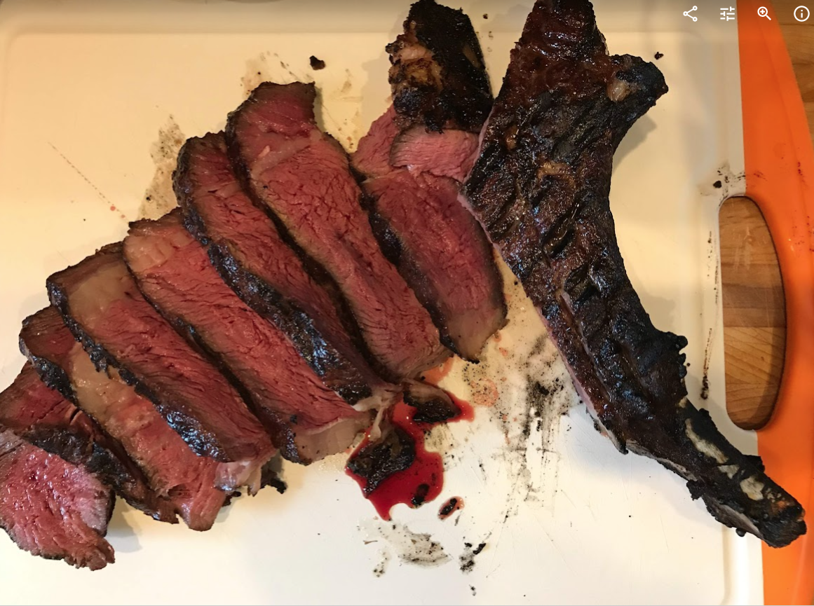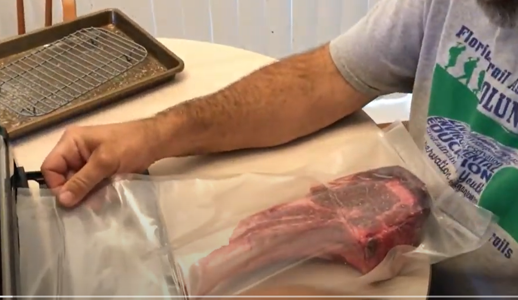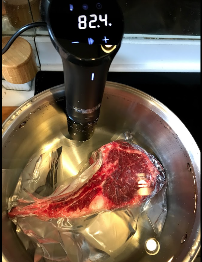 It’s fairly straightforward. You put the machine in a large container of water, seal whatever you’re cooking in a Ziploc or “seal-a-meal” vacuum type bag, set the temperature to the ideal temp for your steak (or whatever), then set the timer (lots of charts with timing available online,) cover the pot or container, and wait. The most work for me is filling the damn pot! When the time is up, your food is at the proper temperature but be forewarned; it will not look very good. You still need to “finish,”, especially meat. You can grill as we did here, sear it in a cast iron pan, or broil it in the oven. Fish you can get away with not doing anything else. We made a Tomahawk-type steak and took some pictures – if you like your meat more well done, you just set the temperature to that. I used 125° for rare, and the internet told me to count on about an hour per inch of meat, so this took about 3 hours, completely unattended.