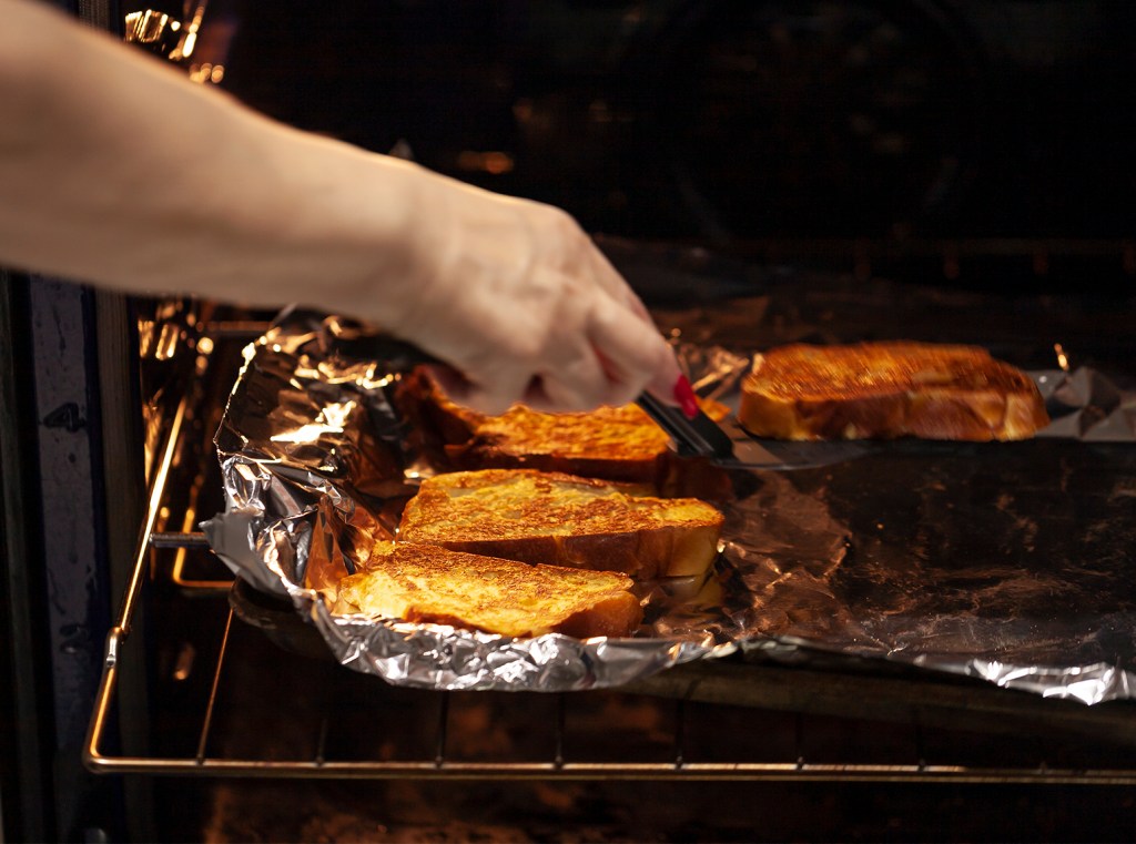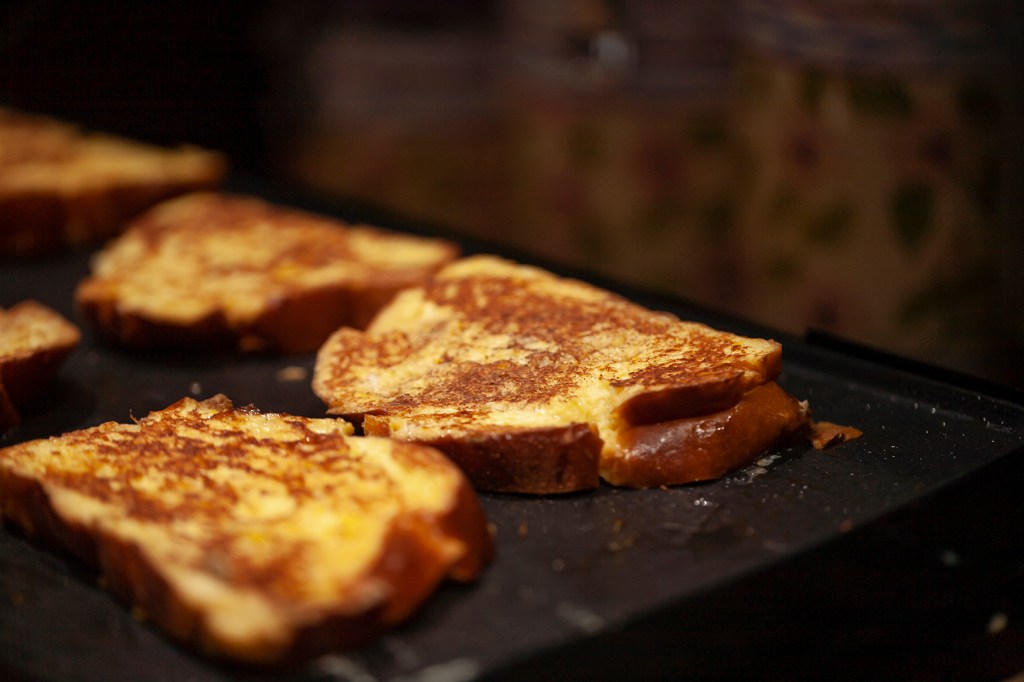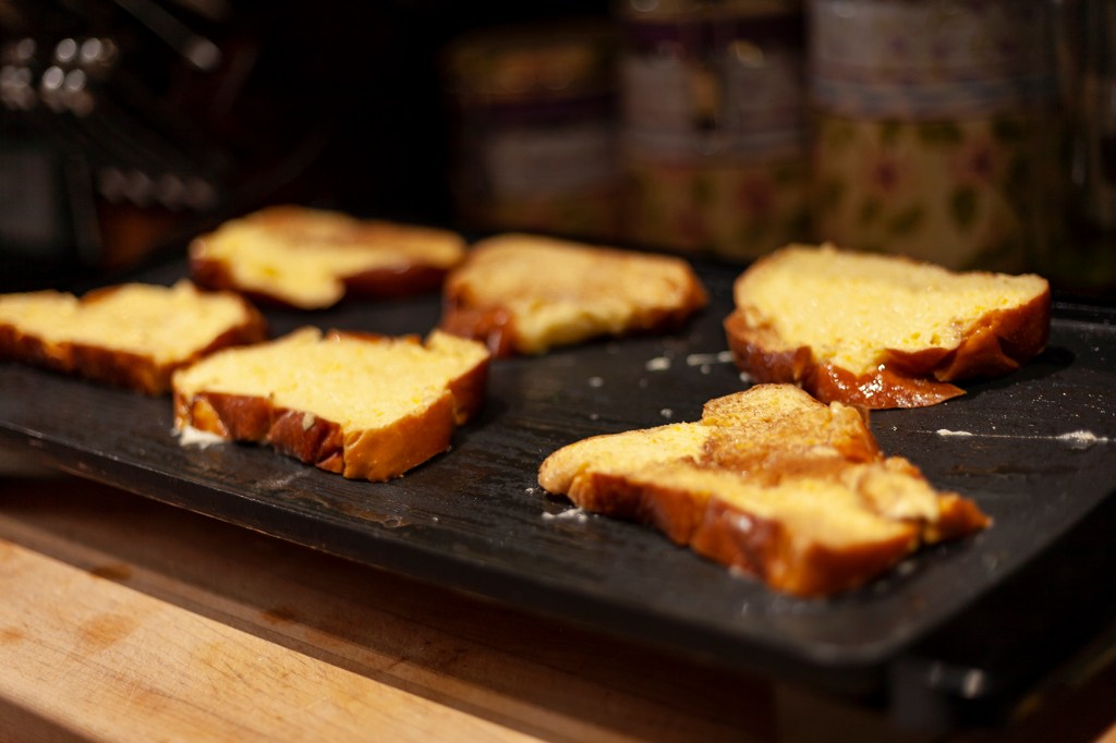 - Heat a large nonstick griddle over medium heat. Melt about a tablespoon of butter in the griddle, then brush butter over entire surface. Arrange as many bread slices as will fit comfortably on the griddle, then cook until golden brown, 3 to 5 minutes on each side. As slices are finished, put them on the sheet pan in the oven to keep warm. Repeat with remaining bread.