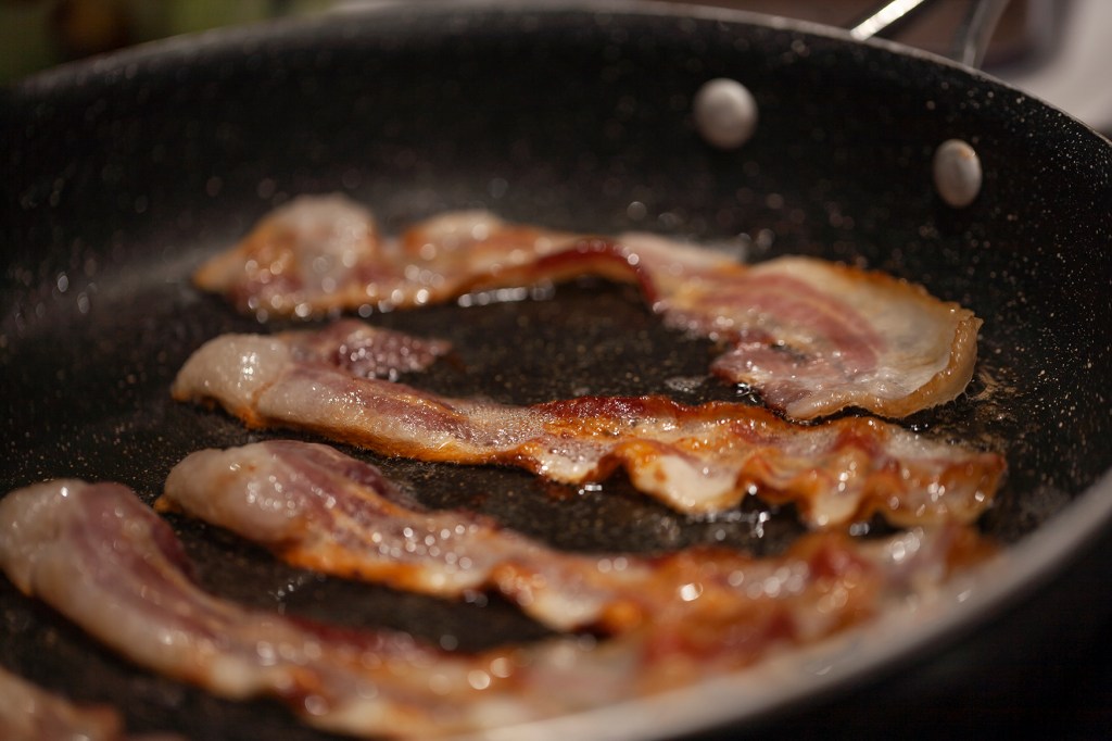 - Top French Toast with warm maple syrup and sliced fruit (I like berries & bananas, but Trader Joe’s frozen berry mixture or berries & cherry mixture are great; I keep bags of those on hand.) And don’t forget the side of bacon! Or breakfast sausage, if you prefer. We really like Morning Star Farms vegan breakfast sausage, too.