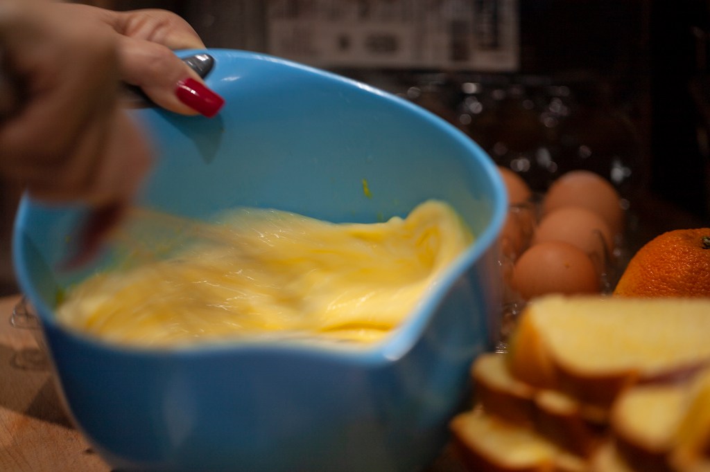 - Whisk together milk, cream, orange zest, lemon zest, cinnamon, salt, eggs, and egg yolks in a bowl until completely combined. Pour egg mixture over the bread. Let stand for a couple of minutes; turn bread slices, and let stand until egg mixture is absorbed, about 4 minutes altogether.