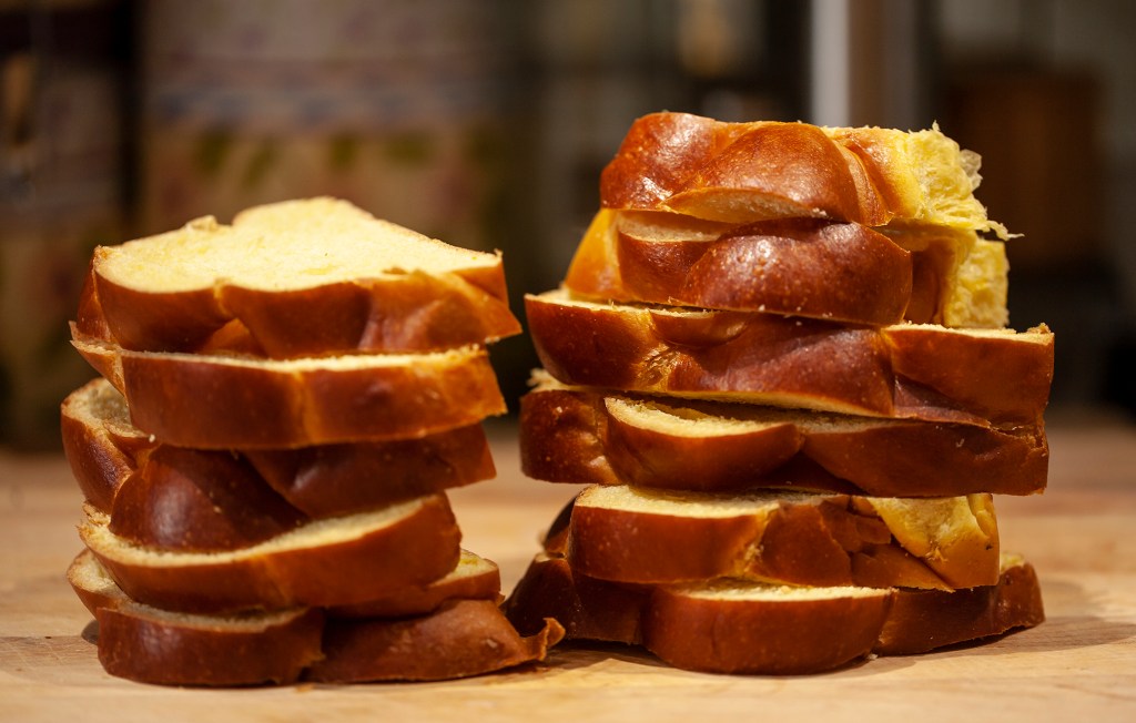 - Slice challah about 1″ thick and lay out on a sheet pan without overlapping. Leave out for several hours (overnight is best) or if you don’t have time, bake on a foil-lined sheet pan in a 250 degree oven for about ten minutes. You just want the bread to dry out a bit.