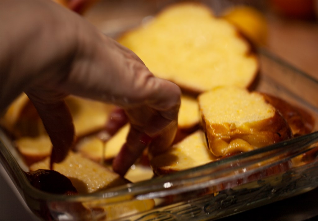 French Toast, part of my “soft food” rotation (my husband had his second gum surgery yesterday,) became part of my daughter’s final in her Photojournalism class. It is a recipe I mostly made up in my head, so I had to guesstimate the amounts of ingredients. She photographed the process from beginning to end, and her photos made me look like a food star! French toast anyone?