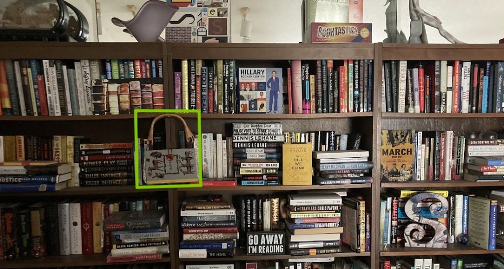 One of my prize possessions (which wouldn’t fit this display) is a handbag made from an old children’s book that I found in a thrift shop many years ago. I’ve never actually used it, but it hangs in the front of my living room fiction collection. When I eventually move, and the books have all gone to that great big library in the sky (someone else’s house), I will gift it to my granddaughter in hopes that she will use it. Maybe she’d also love the Hillary Clinton paper doll book!